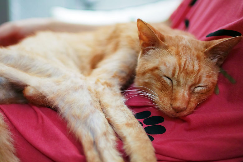 肝心のモギちゃんは、私たちの不安な思いをよそに、日に日に甘えん坊に進化していきました。ソファに寝転んでいるとおなかの上にのぼってきて何時間も昼寝をしたり、仕事をしていると膝の上にぽんっと飛び乗り、かまってほしそうに鳴いたり。眉間を撫ででやるととろんとした表情になり、いびきをかいて寝たりすることも増えました。もともと食べ物に目がないようでしたが、さらに食い意地も張って、体重も少しずつですが増えてきました。これだけ元気なんだからきっと大丈夫、そう私たちも思うようになりました。